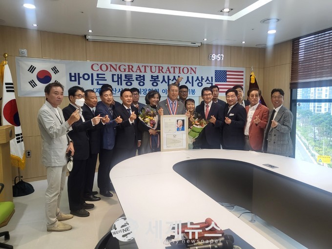 ▲ 군산사회복지 장학회 김기봉 이사장이 죠 바이든 대통령 봉사상 금상을 수상하는 영예를 안았다. |