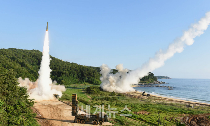 ▲ 북한의 대륙간탄도미사일(ICBM) 도발에 대응해 5일 오전 동해안에서 열린 한미 연합 탄도미사일 타격훈련에서 한국군 탄도미사일 현무-2A(왼쪽)와 주한미군 에이태킴스(ATACMS)가 동시 발사되고 있다. © 세계뉴스 |