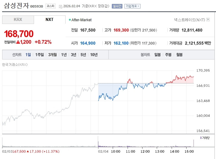 이날 한국거래소와 연합인포맥스에 따르면, 삼성전자는 장중 1.13% 오른 16만9천400원을 기록하며 역대 최고가를 경신, 시가총액이 1천2조원을 넘어섰다. 이는 삼성전자가 지난해 10월 27일 종가 10만2천원으로 10만원을 넘긴 이후 꾸준히 최고가를 경신해 온 결과다.