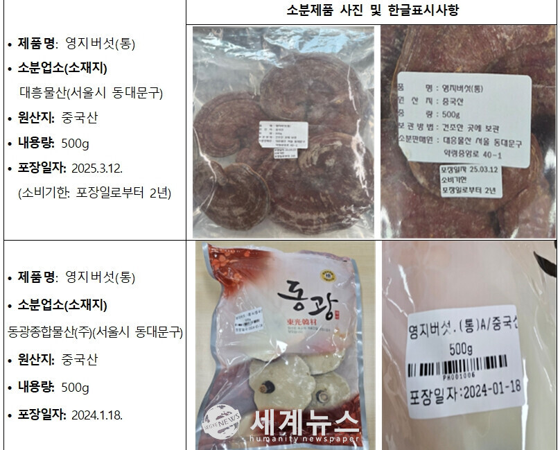 회수 대상 제품은 '정보무역'(서울시 동대문구)이 수입한 중국산 영지버섯(생산년도: 2020년)이며, 이를 '대흥물산'(서울시 동대문구)과 '동광종합물산(주)'(서울시 동대문구)에서 소분 및 판매했다.