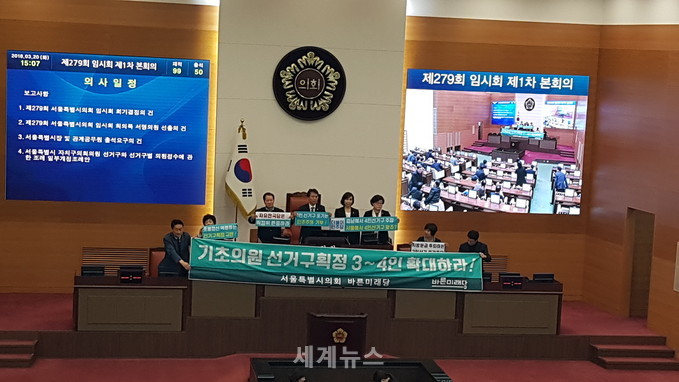 [세계뉴스] 전승원 기자 = 서울시의회 바른미래당은 현 2선거구제는 민주당과 한국당이 독식하는 구조로 맞지 않다며 3~4인 선거구제로 확대를 촉구하고 본회의장을 점거하고 농성중이다.
