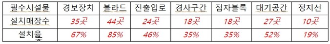 시설물별 설치현황은 경보장치 35개소(67%), 볼라드 44개소(85%), 진출입로 24개소(46%), 경사구간 18개소(35%), 점자블록 18개소(35%), 대기공간 27개소(52%), 정지선 10개소(19%)로 나타났다.