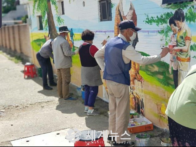 ▲ 담주마을 벽화그리기 봉사활동에 나선 어르신들이 벽화에 열중하고 있는 모습. |