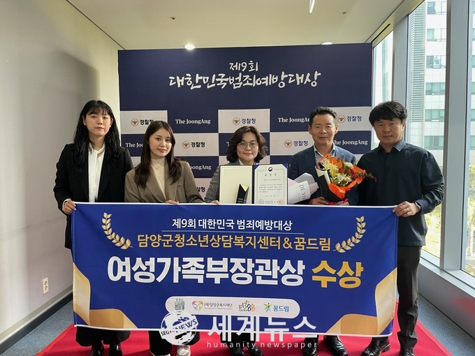 [세계뉴스 양경희 기자] (재)담양군복지재단(이사장 이정옥)이 위탁 운영하고 있는 담양군 청소년상담복지센터는 30일 서울특별시 마포구 중앙일보홀에서 개최된 ‘제9회 대한민국 범죄예방대상’에서 사회적 약자 보호 분야 여성가족부장관상을 받았다고 밝혔다.