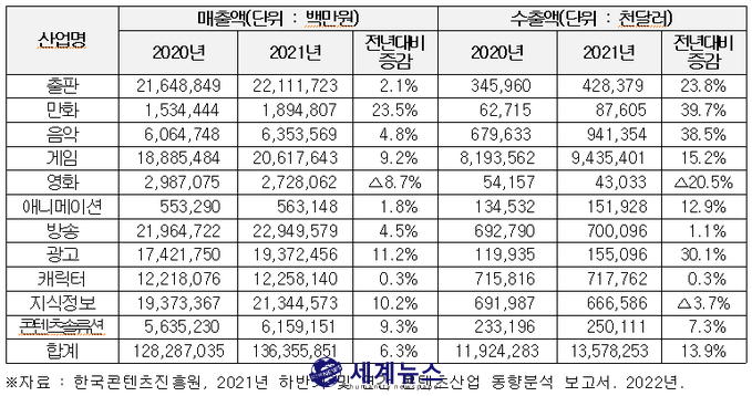 ▲ 콘텐츠산업별 2021년 매출·수출·종사자 현황. |