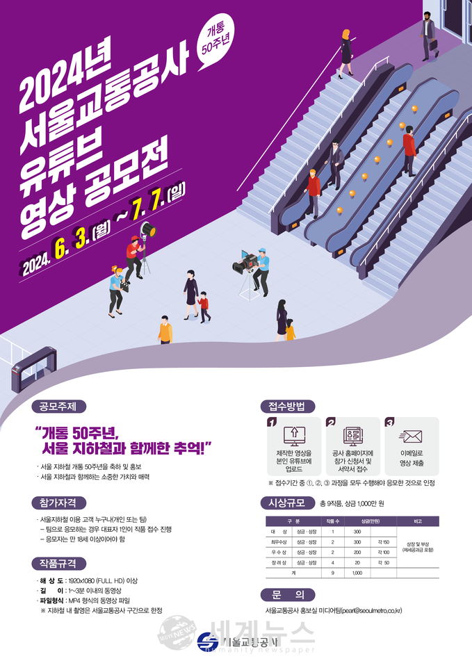 [세계뉴스 차성민 기자] 서울교통공사(이하 ‘공사’)는 ‘2024년 유튜브 영상 공모전(이하 ‘공모전’)‘을 개최한다고 밝혔다. 서울지하철 개통 50주년을 기념해 서울지하철과 함께한 추억을 공유하는 동시에 서울지하철의 매력을 재발견하기 위해서다.