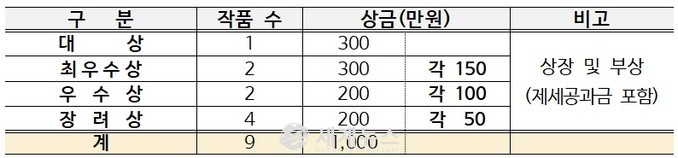 상금 규모는 총 1,000만 원이다. 공사는 두 차례 심사(내부심사‧외부위원 심사)를 거쳐 총 9개 영상 선정하고, 대상 1명에게는 300만 원의 상금을 지급하는 등 수상 작품들에 대해 총 1,000만 원의 상금과 부상을 시상할 계획이다.