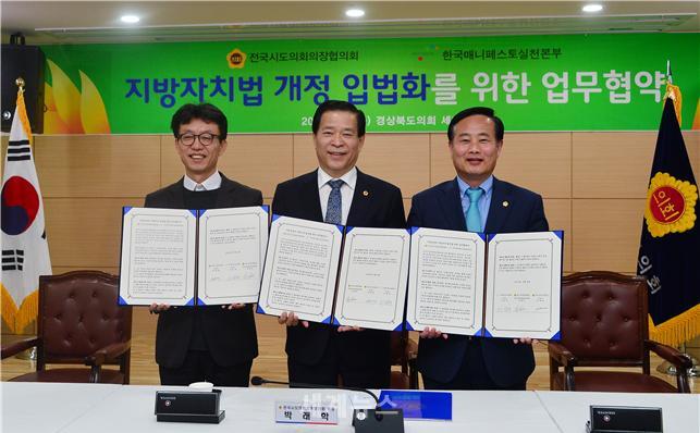 [세계뉴스] 정서영 기자 = 박래학 전국시.도의회의장협의회 회장(서울시의회 의장)은 한국매니페스토실천본부(사무총장 이광재)와 8일 오전 11시 경상북도 의회(안동소재)에서 “지방자치법 개정 입법화를 위한 업무협약(MOU)“ 을 체결했다.