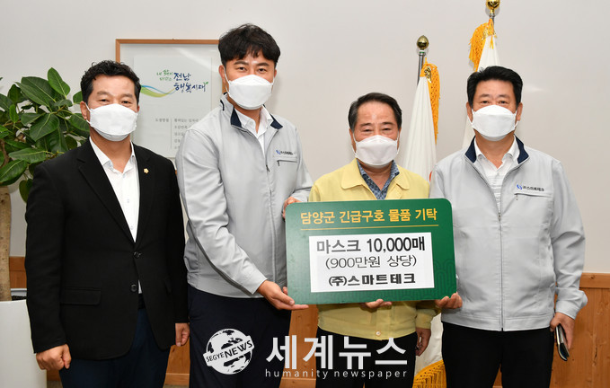 이날 기탁식에는 최형식 담양군수, 김정오 담양군의회 의장, ㈜스마트테크 김순재 대표 등 관계자가 참석했다.