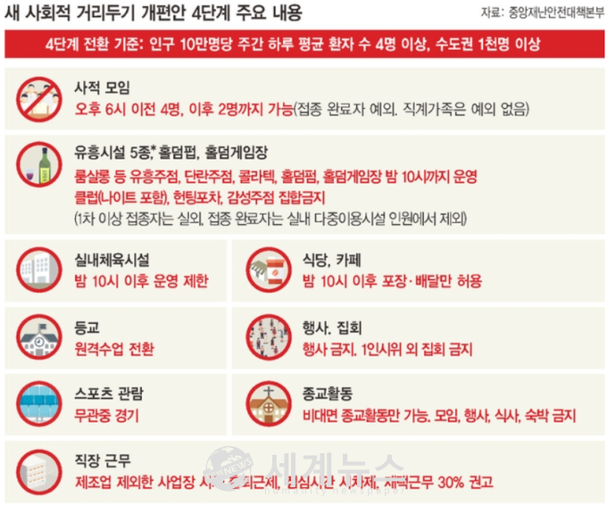 [세계뉴스 전승원 기자] 정부가 신종 코로나바이러스 감염증(코로나19) 확산세가 거센 수도권의 ‘사회적 거리두기’를 최고 수위인 4단계로 격상했다.