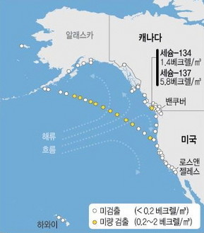 연구소는 지난해 11월 미 캘리포니아 북부에서 150㎞ 떨어진 태평양 해상에서 탐지 가능한 방사능을 포함한 샘플을 처음으로 수거했으나 북미 연안 샘플에서 방사성 물질이 검출된 적은 없었다고 밝혔다.