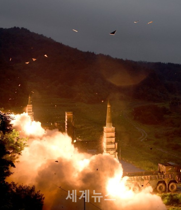 ▲ 한미 양국이 동해안에서 실시한 연합 탄도미사일 사격훈련에서 사거리 300km의 현무-2가 발사되고 있다. © 세계뉴스 |