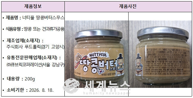 [세계뉴스 = 차성민 기자] 식품의약품안전처는 경기도 고양시에 위치한 식품 제조업체 '주식회사 푸드홀릭'이 제조하고 서울 강남구에 위치한 '(주)큐브릭코퍼레이션'이 판매한 '너티풀 땅콩버터스무스' 제품에서 아플라톡신이 기준치를 초과 검출됐다고 밝혔다. 이에 따라 해당 제품의 판매를 즉각 중단하고 회수 조치를 시행한다.