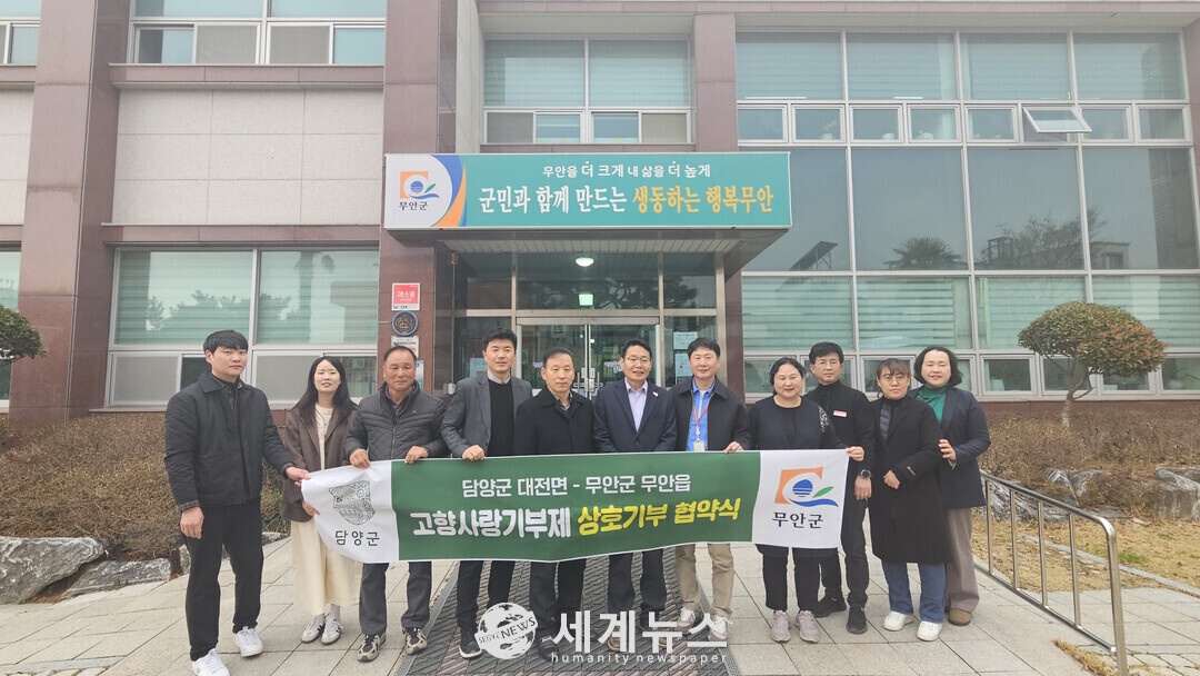 [세계뉴스 = 양경희 기자] 담양군 대전면은 지난 18일 오후 2시 무안읍사무소에서 담양군 대전면과 무안군 무안읍 간 고향사랑기부제 활성화를 위한 업무 협약식을 진행했다고 전했다.