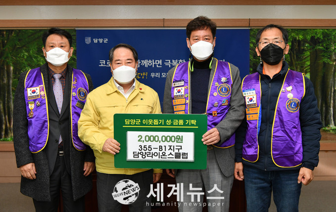 [세계뉴스 양경희 기자] 설 명절을 앞두고 담양군에 지역사회를 밝히는 이웃사랑이 전달되고 있다. 회원 45명으로 구성된 355-B1지구 담양라이온스클럽은 지난해 집중호우로 어려운 주민을 위해 백미 10kg 100포(3백만 원 상당), 컵라면 50상자와 백숙을 지원했으며, 이날 장애인시설 빛고을공동체와 시각장애인협회에 각 100만원을 기탁했다.