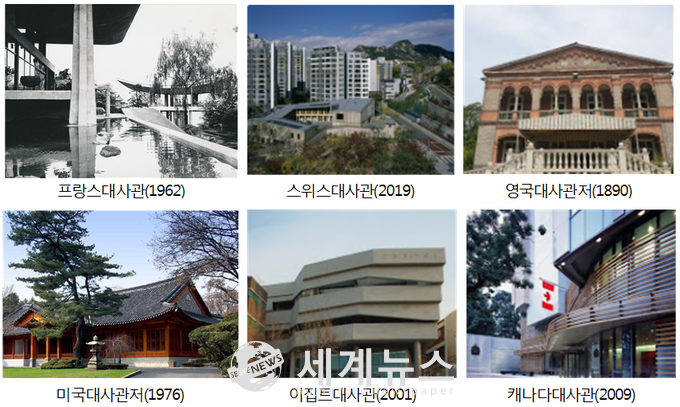 ‘영국대사관’은 지어진지 129년 돼 우리나라에서 가장 오래된 대사관이다. ‘프랑스대사관’은 근대건축계 거장인 김중업이 설계했고 한국현대건축의 걸작으로 꼽힌다. ‘스위스대사관’은 한옥과 마당을 건축의 주요 키워드로 삼은 현대적 건축물로, 지난 5월 정식 개관했다. ‘미국대사관’은 주재국의 전통건축 양식으로 지은 국내 최초의 건축물이 포함돼 있다. ‘캐나다대사관’은 자작나무숲과 산을 모티브로 설계됐다. ‘이집트대사관’은 고대이집트 문명을 재발견하게 한 로제타스톤을 재해석해 지어졌다.