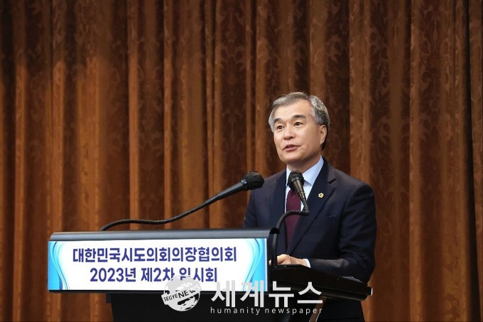 ▲ 지난 대한민국시도의회의장협의회 2023년 제2차 임시회에서 김현기 회장이 인사말을 하고 있다. |