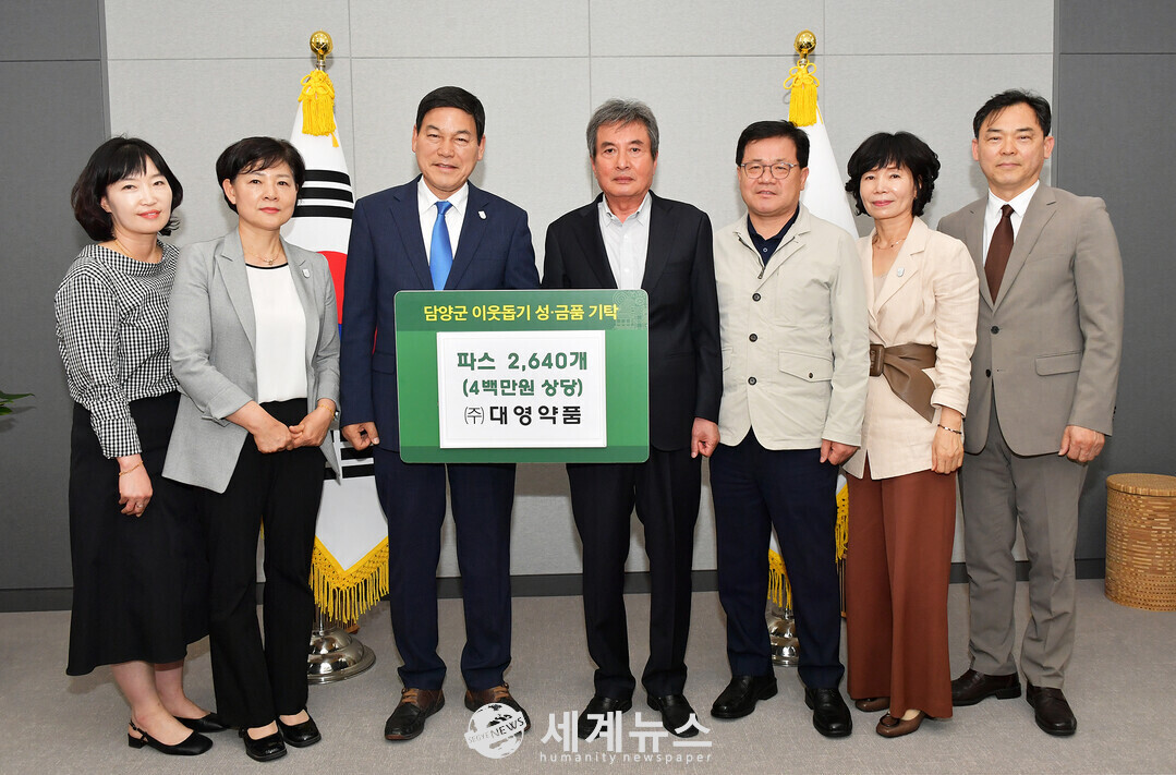 [세계뉴스 = 양경희 기자] 담양군(군수 정철원)은 ㈜대영약품(대표 박종선)이 지난 13일 지역 내 건강관리가 필요한 이웃들을 위해 의료용품 2,640개(400만 원 상당)를 기탁했다고 밝혔다.