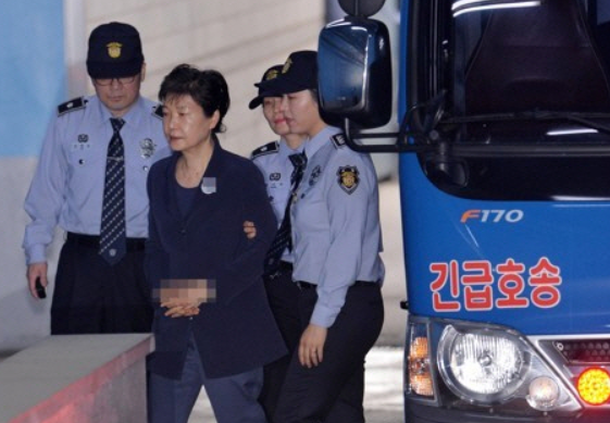 ▲ 23일 오전 호송차에서 내려 법정으로 들어서고 있는 박근혜 전 대통령. © 세계뉴스 |