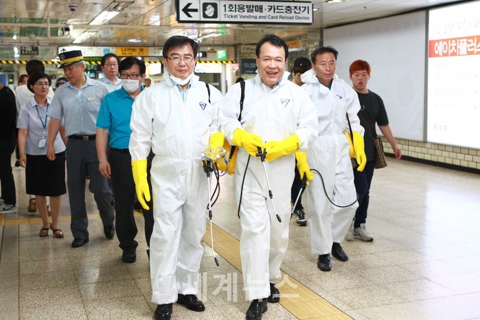 ▲ 서울메트로 지하철 2호선 신림역에서 신언근 서울시의원(오른쪽)이 서울시 지하철 메르스 예방 및 확산 방지 대책과 방역.소독 작업 등을 점검하고 방역작업에 직접 참여하고 있다.© 세계뉴스 |