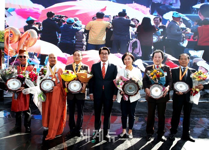 ▲ 유종필 관악구청장(가운데)이 ‘2017 관악 강감찬 축제’에서 ‘제25회 관악구민상’ 시상식을 열고 6개 부문 수상자들에게 상패와 메달을 수여했다. © 세계뉴스 |