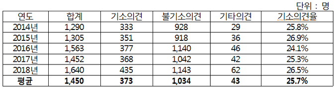 소 의원이 경찰청으로부터 제출받은 자료에 따르면 최근 5년간 전체 형사입건된 사람은 평균 171만 9,749명이다. 경찰은 그 중에서 110만 5,075명을 기소의견으로, 56만 3,577명을 불기소의견으로, 5만 1,097명을 기타의견(이송, 참고인중지)로 검찰에 송치했다. 평균적으로 64.2%의 기소의견율을 보인 것이다.