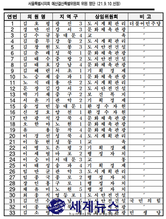 [세계뉴스 윤소라 기자] 서울시의회는 지난 10일 개최된 제302회 임시회 본회의에서 내년도 서울시와 서울시교육청의 예산을 심사·의결할 33명의 예산결산특별위원회 위원을 선임하고, 위원장으로 김호평 의원(더불어민주당, 광진3)을 선출했다.