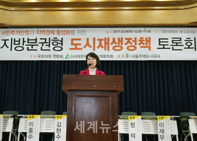 ▲ 9일 '지방분권형 도시재생정책 토론회'에 참석한 전현희 국회의원이 인사말을 하고 있다. © 세계뉴스 |