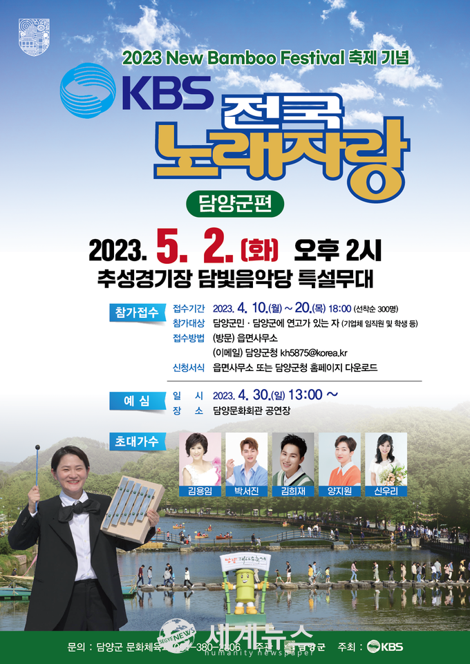 [세계뉴스 양경희 기자] 전 국민의 사랑을 받는 KBS 전국노래자랑이 오는 5월 2일 ‘2023 New Bamboo Festival’과 담빛음악당 개관을 기념해 담양군에서 개최된다.