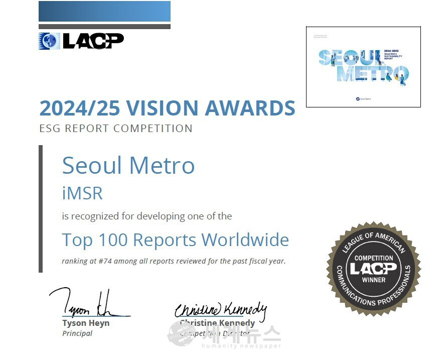 [세계뉴스 = 차성민 기자] 서울교통공사가 세계적 권위를 가진 홍보·마케팅 전문기관 미국 커뮤니케이션연맹(LACP)이 주관하는 ‘2024/25 비전 어워즈(Vision Awards)’ ESG 보고서 부문에서 최고 등급인 대상(Platinum)을 수상했다. 국내 지방공기업 가운데 올해 비전 어워즈에서 수상한 곳은 서울교통공사가 유일하다.