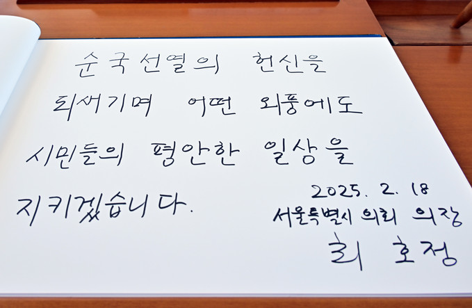 최 의장은 “순국선열의 헌신을 되새기며 어떤 외풍에도 시민들의 평안한 일상을 지키겠습니다”라고 방명록에 남겼다.