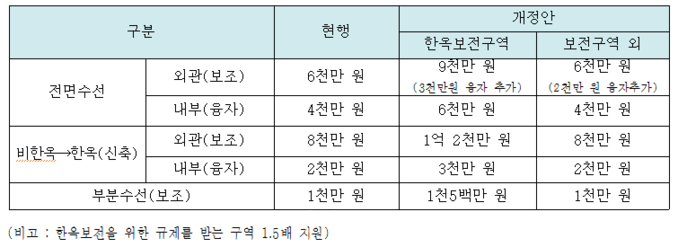 한옥보전구역이 아닌 지역은 전면수선 시 외관수선비를 현행 6천만 원에서 추가 2천만 원까지 융자가 가능하도록 조정하였다. 전면수선 내부공사, 비한옥을 한옥으로 신축하는 경우, 부분수선, 지원금 지원주기 등은 현행대로 유지한다.