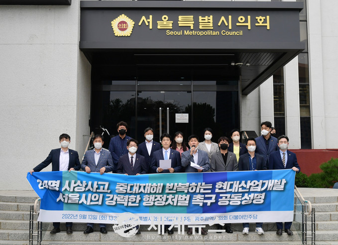 [세계뉴스 정서영 기자] 서울특별시의회 더불어민주당과 광주광역시의회 더불어민주당은 13일 오후 1시 30분 서울시의회 본관 앞에서 기자회견을 갖고 연이은 대형사고로 노동자와 시민의 생명을 앗아간 HDC현대산업개발(이하 현대산업개발)에 대한 서울시의 강력한 행정처분을 촉구했다.