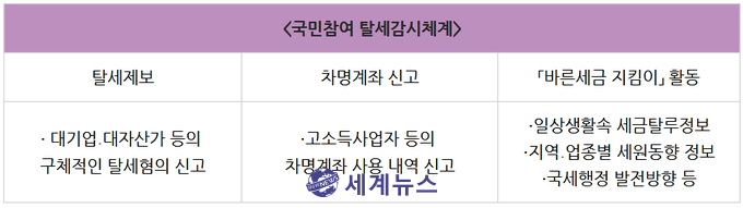 [세계뉴스] 윤소라 기자 = 국세청이 국민이 참여하는 탈세감시체계를 더욱 활성화하고 국민탈세감시단인 ‘바른세금 지킴이’ 운영을 대폭 개편했다.