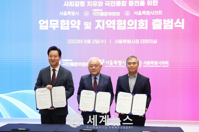 서울특별시의회는 2일 서울시청에서 서울시의회-국민통합위원회-서울시 3자 업무협약식을 갖고 사회 갈등을 해소하고, 국민 화합을 실현하기 위해 구체적인 협력과 논의에 들어갔다.