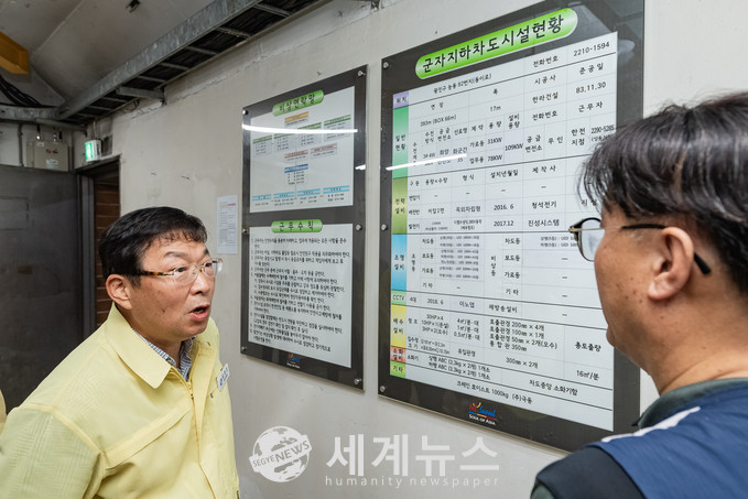 [세계뉴스 조홍식 기자] 김경호 광진구청장이 18일 오후, 군자지하보도와 차도를 긴급 점검했다. 폭우에 대비하여 구청 직원, 성동도로사업소 직원들과 함께 지하차도의 배수로와 배전 설비 등의 작동유무를 확인하고 위험요소를 살폈다.