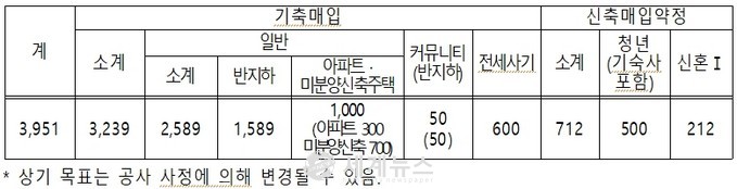 [세계뉴스 조홍식 기자]서울주택도시공사(사장 김헌동)가 올해 반지하 주택 및 신축매입약정 유형 외 기존 아파트, 전세사기주택 등 신규 유형을 추가해 약 4,000세대를 매입한다.