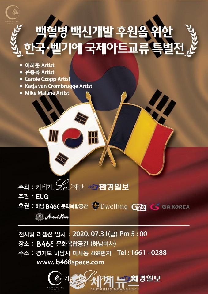 [세계뉴스 윤소라 기자] 카네기Lee재단은 오는 31일 오후 5시 ‘백혈병 백신개발 후원을 위한 한국‧벨기에 국제아트교류 전시회’를 경기도 하남 미사리 복합문화공간 B468에서 개최한다고 밝혔다.