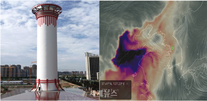 ▲ 중국에서 시범운영중인 대형 공기청정기(높이 100m). ▲ 중국발 미세먼지 이동 사진. |