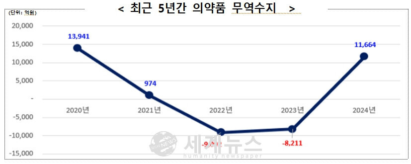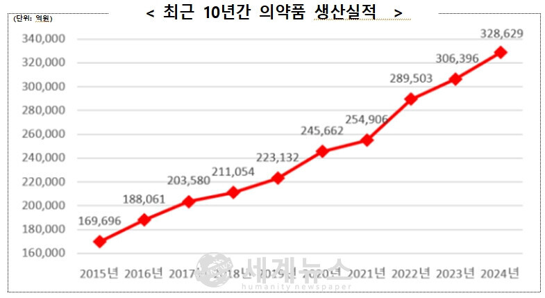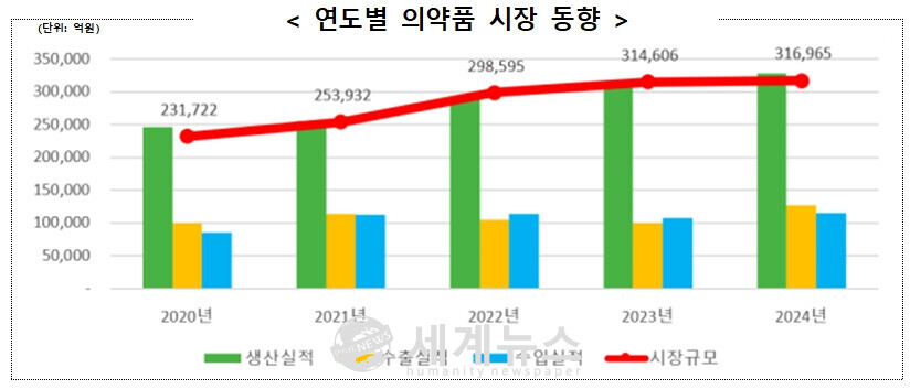 [세계뉴스 = 전승원 기자] 식품의약품안전처는 2024년 국내 의약품 생산실적이 전년 대비 7.3% 증가한 32조 8,629억 원으로, 통계 집계가 시작된 1998년 이후 역대 최고치를 기록했다고 27일 밝혔다. 같은 해 의약품 수출은 12조 6,749억 원으로 28.2% 급증하며 3년 만에 무역수지가 흑자(1조 1,664억 원)로 전환됐다.