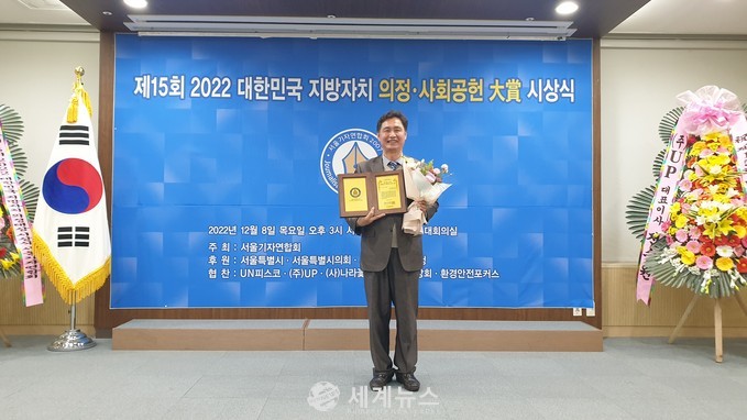 [세계뉴스 정서영 기자] 서울시의회 도시안전건설위원회에서 의정활동을 하고 있는 박칠성 부위원장(더불어민주당, 구로4)이 8일 서울시의회 의원회관 제2대회의실에서 개최된 ‘제15회 2022년 대한민국 지방자치 의정·사회공헌 대상 시상식’에서 의정대상을 수상했다.