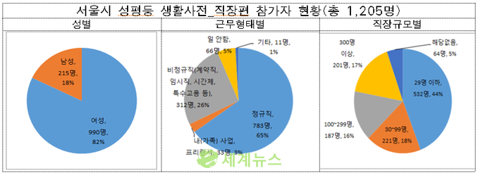 또한 의견을 제안한 1,205명 중 여성은 82%, 남성은 18%를 차지했고, 20·30·40대가 94%였다. 근무형태별로는 ▲정규직 65% ▲비정규직 26%, 직장규모별로는 ▲300인 이상 17% ▲100~299인 16% ▲ 30~99명 18% ▲30인 미만이 44%였다.