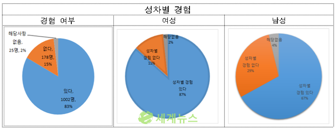 ‘직장(일 터)에서 성차별적인 말을 듣거나 행동을 경험한 적이 있나’라는 질문에는 참여자의 83%(1,002명)가 “있다”고 답했다. 여성의 약 87%(858명)가, 남성의 67%(144명)가 성차별을 경험한 것으로 나타났다.