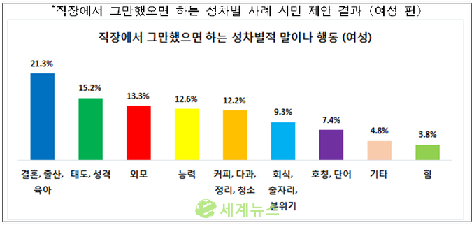 여성이 경험하는 성차별 말과 행동 중 ‘결혼, 출산, 육아(21.3%)’ 관련 내용이 1위를 차지했다. 아이 때문에 연차를 쓸 때 “여자는 이래서 안 돼”라거나 “여성은 결혼을 하면 끝” 등의 말을 듣기 싫다고 지적했다. 2위로 “이런건 여자가 해야지” 등 성별고정관념에 기반한 ‘태도, 성격(15.2%)’이 뒤를 이었으며, 3위는 ‘외모(13.3%)’로 화장, 옷차림, 몸매와 관련된 칭찬 또는 잔소리를 아무렇지 않게 하는 직장 문화를 꼬집었다. 4위는 같은 일을 해도 여성이라는 색안경을 끼고 보는 “여자치고는 잘하네”, “독해서 승진한거다” 등의 ‘능력(12.6%)’이, 5위는 ‘커피, 다과, 정리, 청소(12.2%)’로 회사에서도 여성에게 다과준비, 청소 관련 일을 강요하는 상황이 꼽혔다.