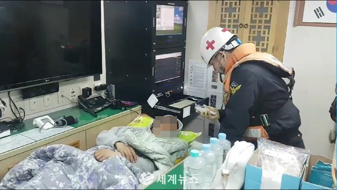 [세계뉴스] 한차수 기자 = 해경이 선박에서 조업하다 크게 다친 20대 외국인 선원을 경비함정으로 릴레이 이송했다.