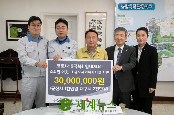 [세계뉴스 윤준필 기자] 군산시는 ㈜세아베스틸 노동조합 서현승 위원장과 박준두 대표이사가 코로나19 확산으로 어려움을 겪는 이웃을 위해 지난 16일 성금 3천만원(군산시 1천만원, 대구광역시 2천만원)을 기탁했다고 밝혔다.