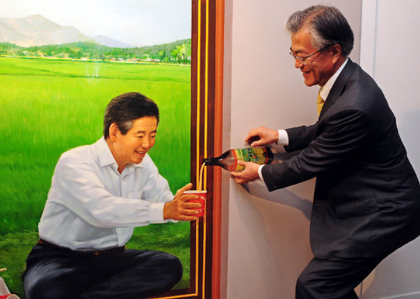 ▲ 노무현 전 대통령 시절 농주를 따르고 있는 문재인 전 비서실장 모습. © 세계뉴스 |
