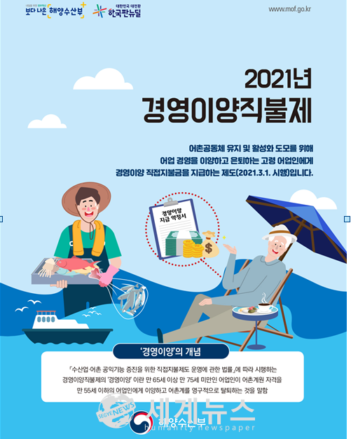 경영이양 직접지불제도(이하 ’경영이양직불제‘)는 올해 3월부터 시행되는 수산분야 공익직불제* 중 하나로, 만 65세 이상부터 만 75세 미만 어촌계원이 만 55세 이하의 어업인에게 어촌계원의 자격을 넘기면 일정액의 직불금을 지급하여 고령 어업인에게는 소득 안정을, 젊은 후계 어업인에게는 적극적인 어촌 진입 기회를 제공한다.