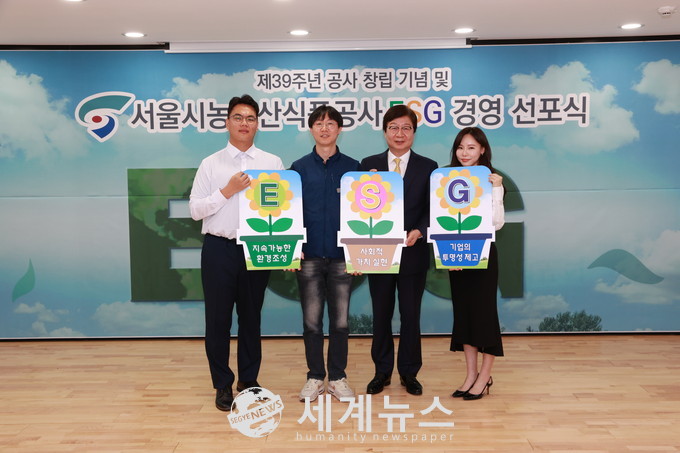 [세계뉴스 전승원 기자] 서울특별시농수산식품공사(사장 문영표)는 11일 공사 13층 강당에서 공사 임직원 전원이 참석한 가운데 ESG(환경, 사회, 지배구조) 경영 선포식을 개최했다.