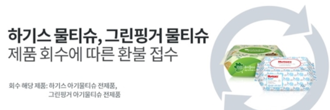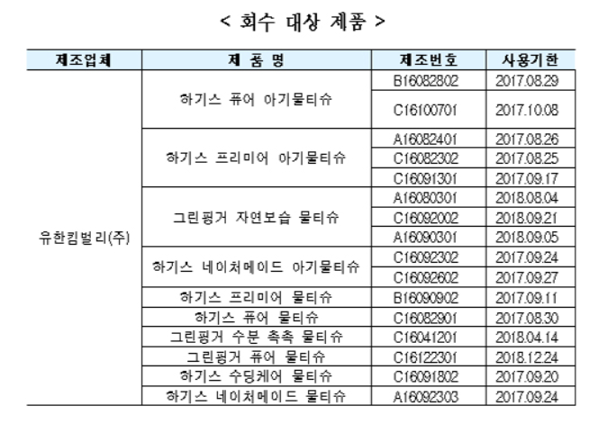 한편 이번에 회수 조치된 제품은 △하기스 퓨어 아기물티슈 △하기스 프리미어 아기물티슈 △그린핑거 자연보습 물티슈 △하기스 네이처메이드 아기물티슈 △ 하기스 프리미어 물티슈 △하기스 퓨어 물티슈 △그린핑거 수분 촉촉 물티슈 △그린핑거 퓨어 물티슈 △하기스 수딩케어 물티슈 △하기스 네이처메이드 물티슈 등이다.